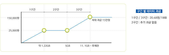 - 5GB 이상은 0.01원/0.5KB(부가세별도)로 이용가능하며 15만원을 초과하는 데이터 요금은 최초 1회에 한하여 면제됩니다.